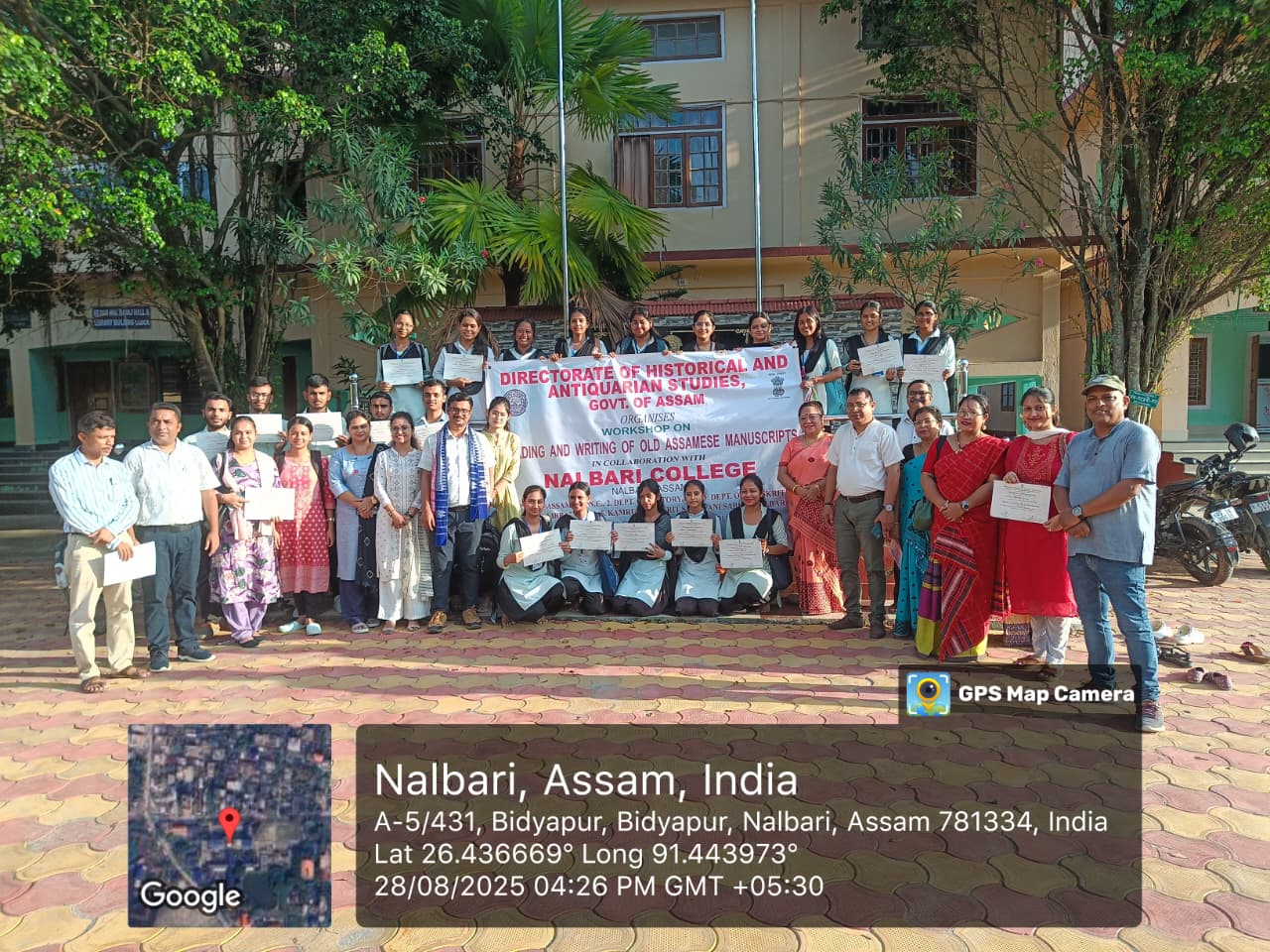 | 2 | Workshop on Reading and Writing of Old Assamese Manuscripts, (26th to 28th August 2025) | A Workshop on “Reading and Writing of Old Assamese Manuscripts”, was organized by the Directorate of Historical and Antiquarian Studies (DHAS), Government of Assam, in collaboration with Nalbari College (Departments of Assamese, History, Sanskrit, and Trailokya Nath Goswami Library) and Kamrup Sanskrit Sanjivani Sabha, Nalbari. 30 participants were given hands on training where Dr. Sangeeta Gogoi, Director i/c, Directorate of Historical and Antiquarian Studies, Govt. of Assam, and Sjt. Dhanjit Talukdar, Archival Asstt., K.K.H. Library, Gauhati University, were acted as resource persons |  |