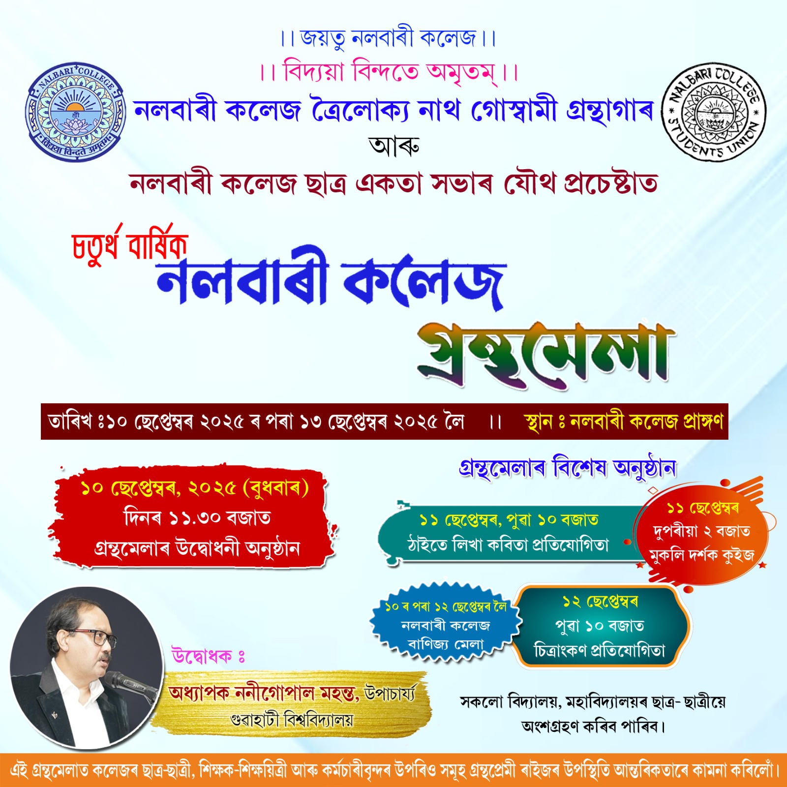 | 1 | 4th Nalbari College Book Fair 2025 (10-09-2025 to 13-09-2025) | Trailokya Nath Goswami Library, Nalbari College and Nalbari College Student's Union Organised a Book Fair from 10/9/2025 to 13/9/2025. The book fair was inaugurated by Prof. Nani Gopal Mahanta , Vice-Chancellor Gauhati University. Art competition, Quiz Competition and Recitation Competition were also organized for the students during the Book Fair. |  |