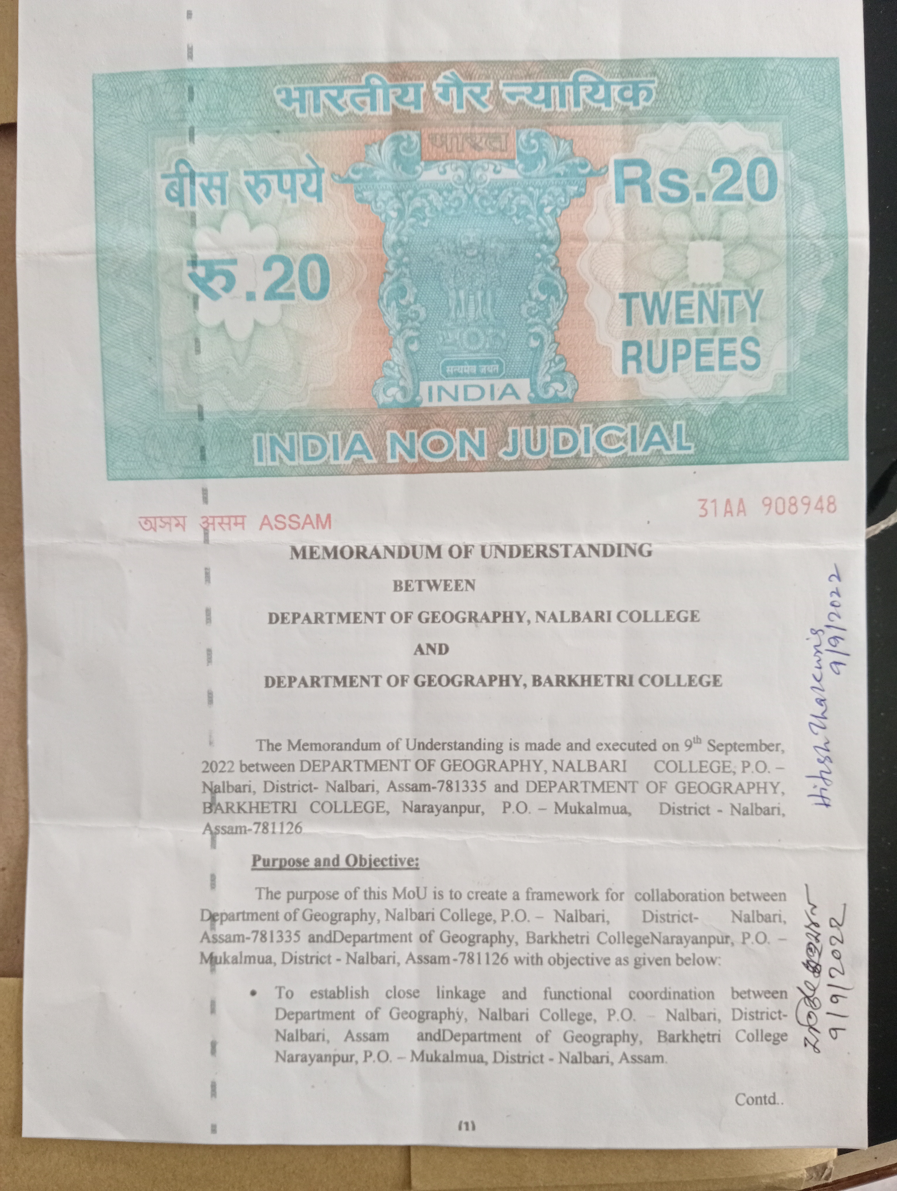 9th.September 2022: MoU has been signed between the Dept of Geography, Nalbari College and the Dept of Geography, Barkhetri College Mukalmua. For Faculty and Student exchange.