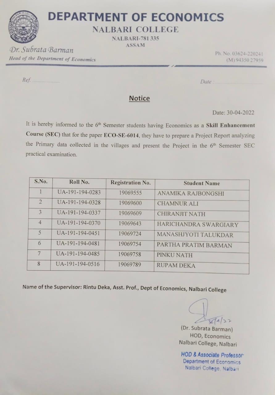 | 262 | Research Project of Students of Nalbari College and Nalbari Commerce College | Department of Economics, Nalbari College and Nalbari Commerce College carried out a research project- Role of Government Schemes for Upliftment of Rural People: A Study in Nalbari District of Assam | 2023-06-06 | View File |