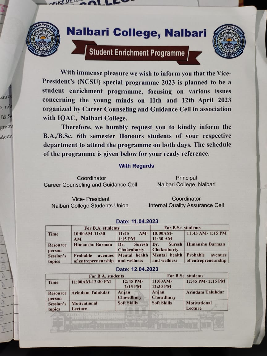The Career Counselling and Guidance Cell of Nalbari College, established in 2015, is a vital lifeline for students navigating their career paths and professional aspirations. This dedicated cell offers personalized guidance, helping students uncover their strengths, interests, and potential career avenues. Through a wide array of services, including workshops, seminars, one-on-one counseling sessions, and industry interactions, the cell aims to arm students with the skills and knowledge necessary to make informed and strategic career choices. By nurturing a supportive and enriching environment, the Career Counselling and Guidance Cell not only assists in academic and career planning but also emphasizes the holistic development of students. This ensures they are well-prepared to meet and conquer the demands and challenges of the professional world. Additionally, the cell fosters connections with industry experts, providing students with valuable insights and networking opportunities. This proactive approach helps bridge the gap between academic learning and real-world applications, empowering students to confidently step into their chosen careers. Overall, the Career Counselling and Guidance Cell at Nalbari College plays an indispensable role in shaping the future of its students, guiding them towards successful and fulfilling professional journeys.